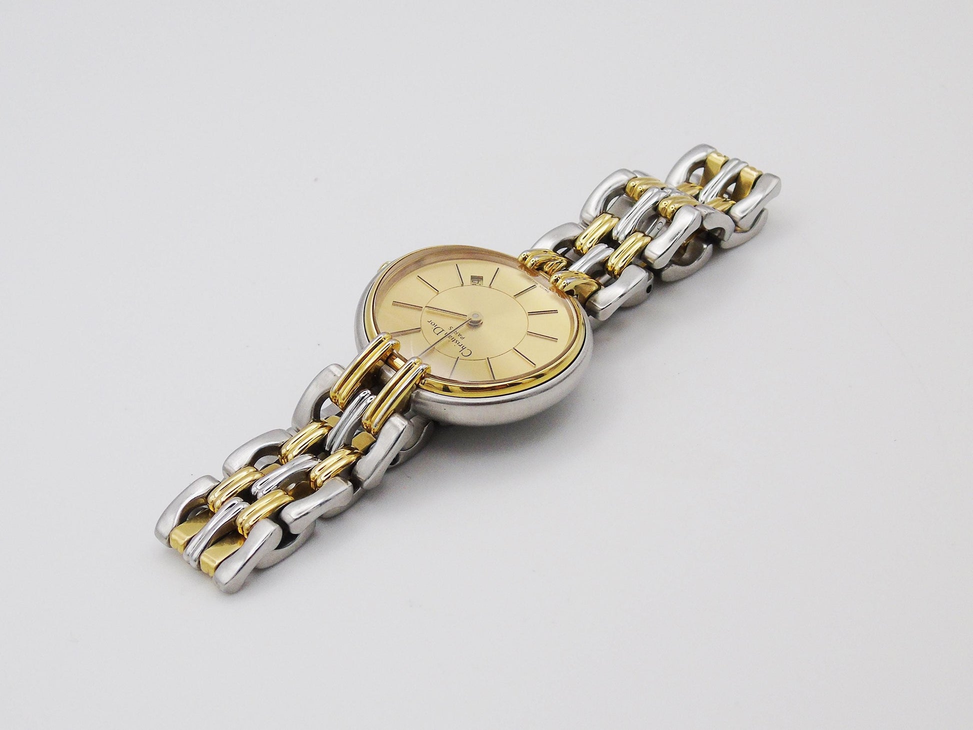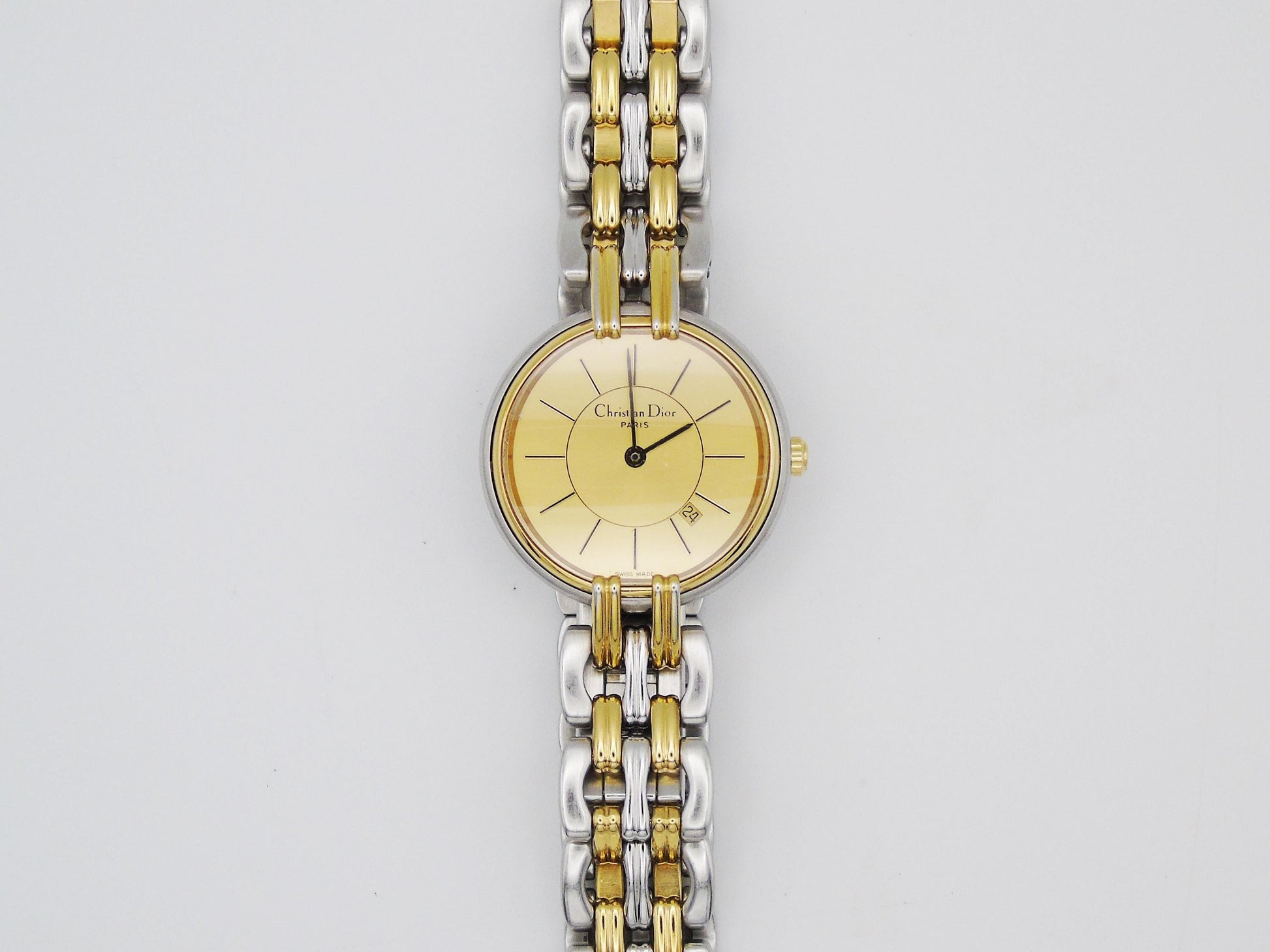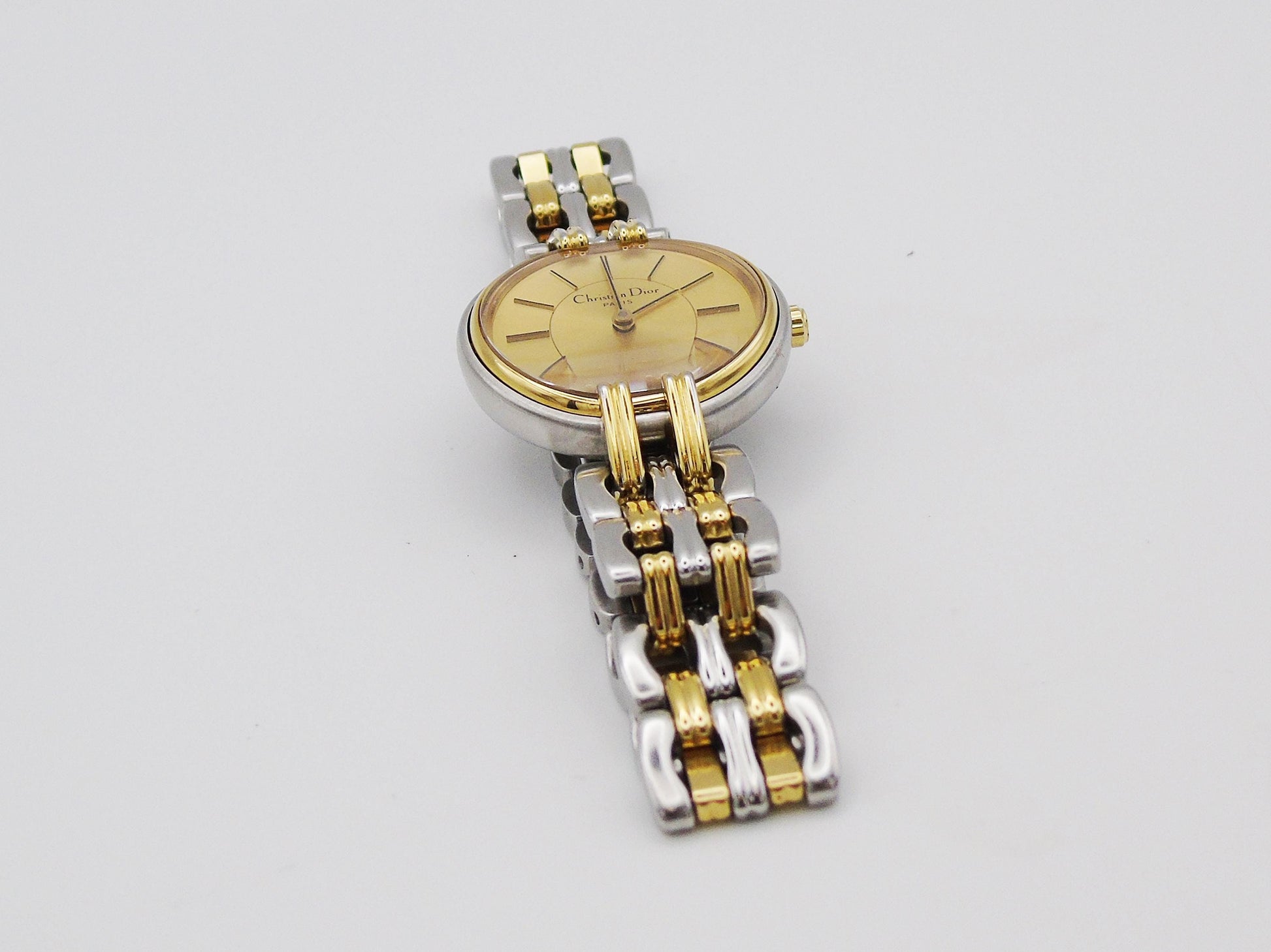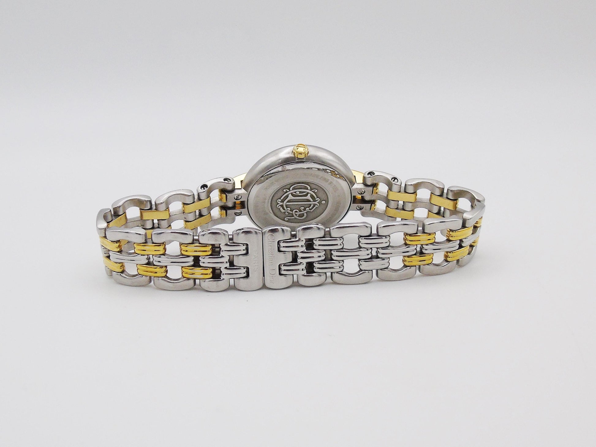 This beautiful Christian Dior ladies watch is a mix of gold and silver colors. It is made of strong stainless steel and is in very good working condition. A new battery has been put in, and the watch keeps time well. The glass on the watch face is clear and has no scratches.