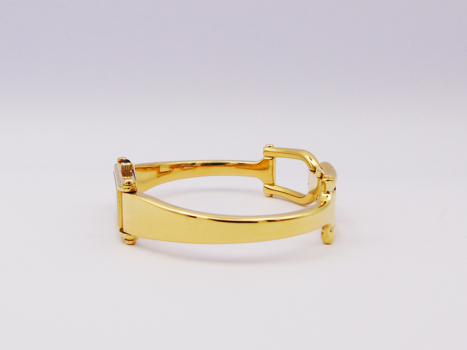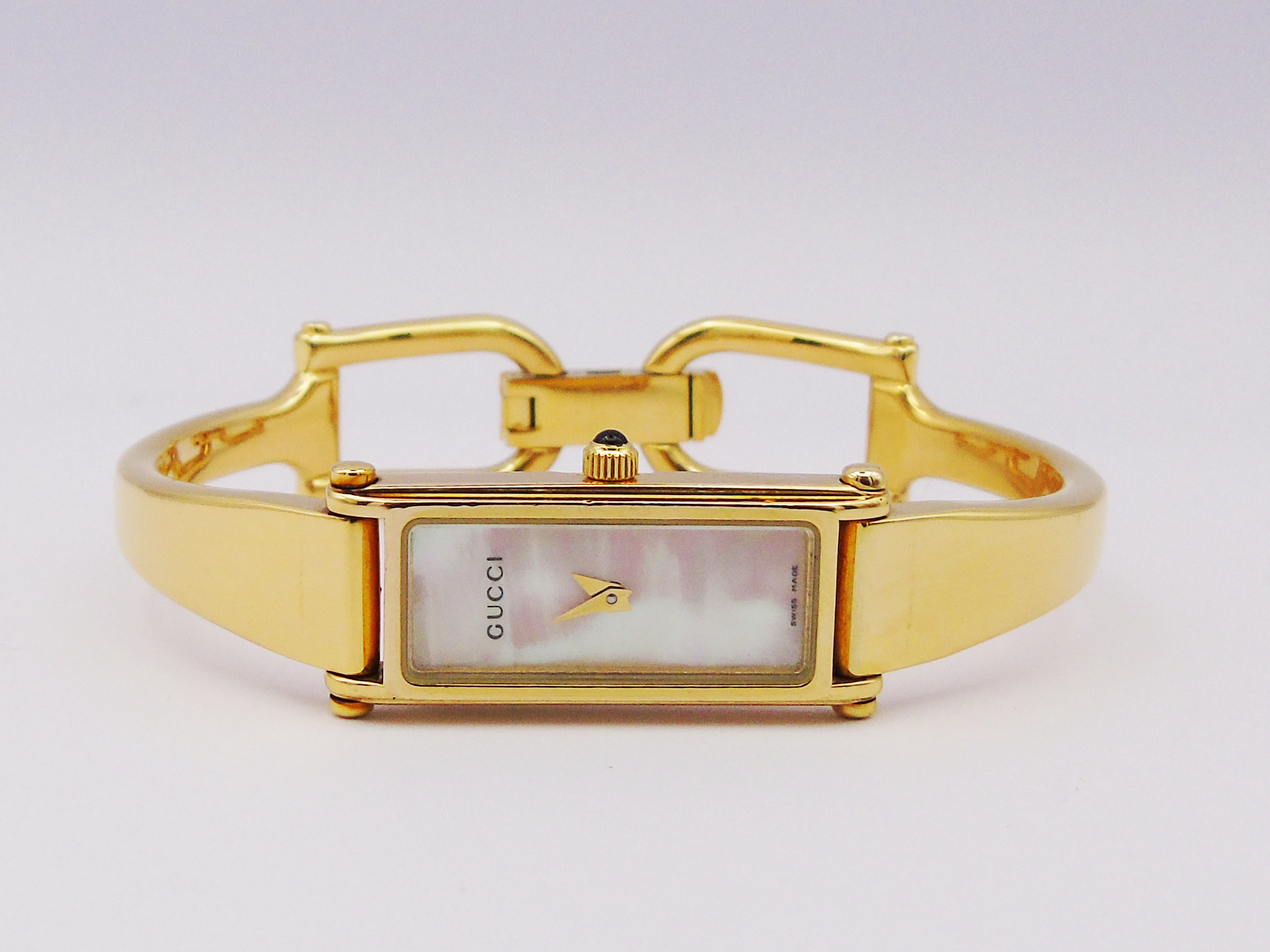 This is a genuine Gucci Ladies Gold Watch is a timeless piece that adds elegance to any collection. The Gucci 1500L model is part of the horsebit collection and it features a stunning mother of pearl dial and a sleek tank watch face, offering a classic and refined look.