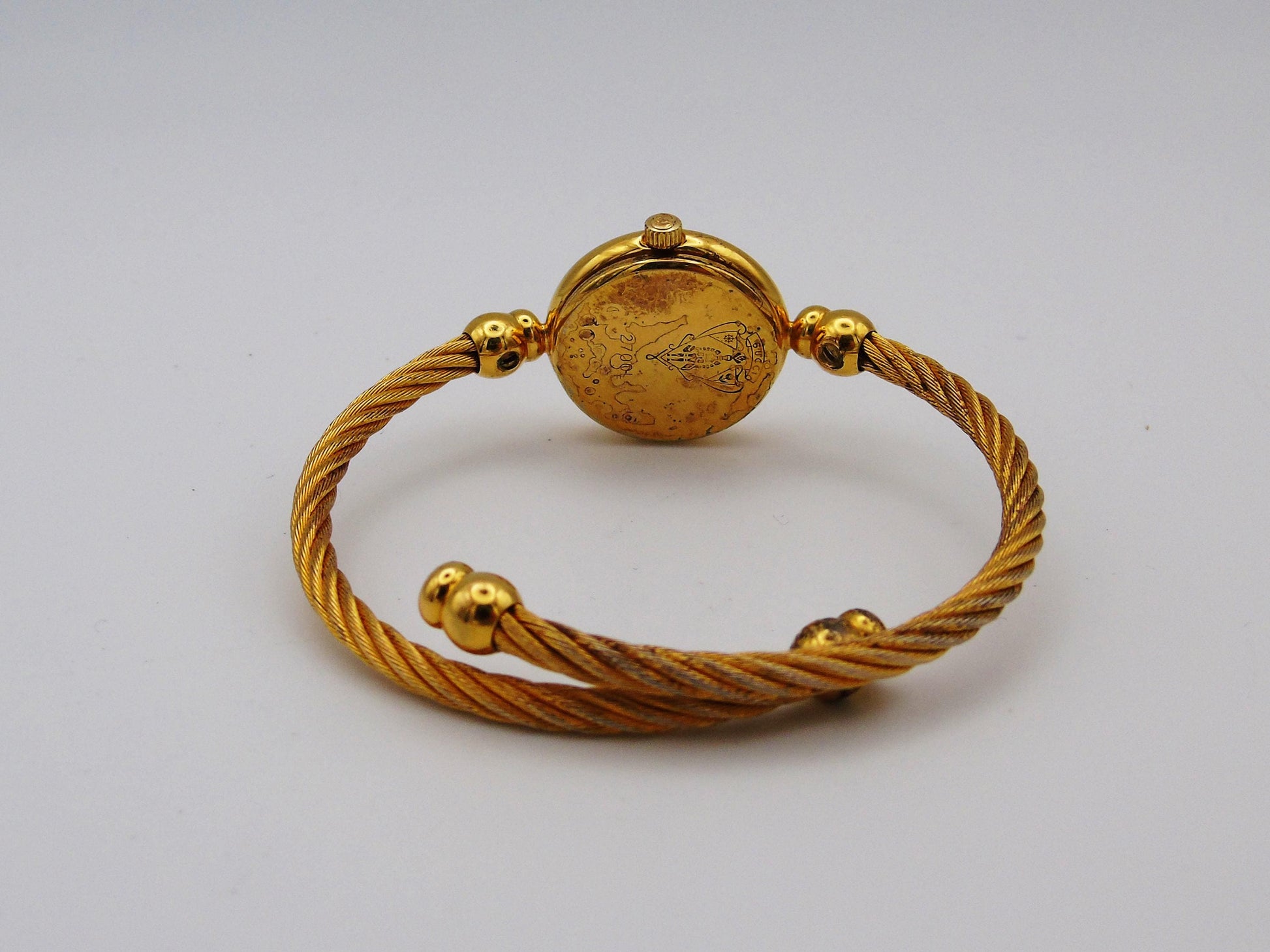 The bangle is rope-like and flexible, so it fits many wrist sizes. The watch comes with its box and papers. This watch is sold as not waterproof. Please look at all the photos to see the condition.