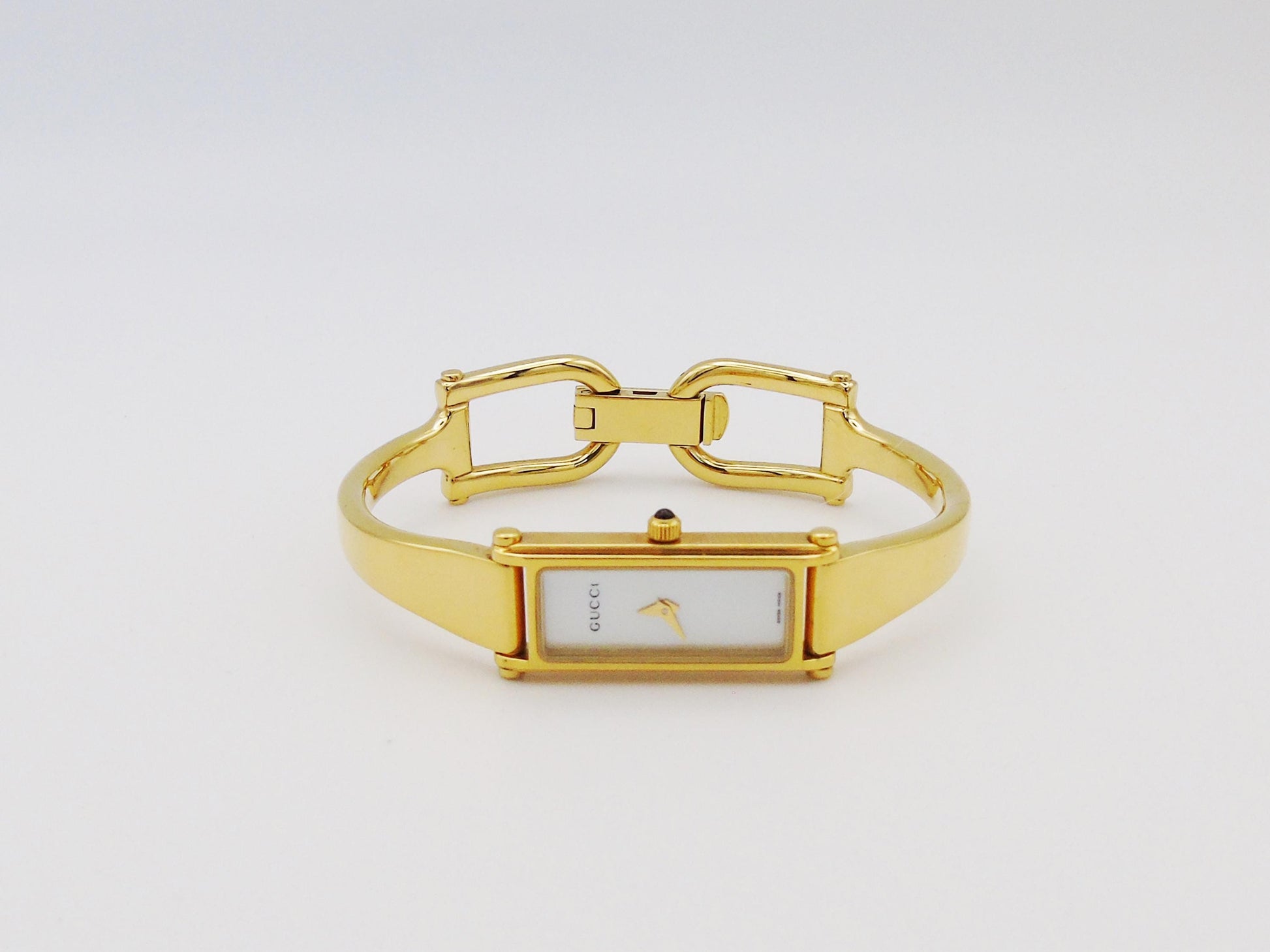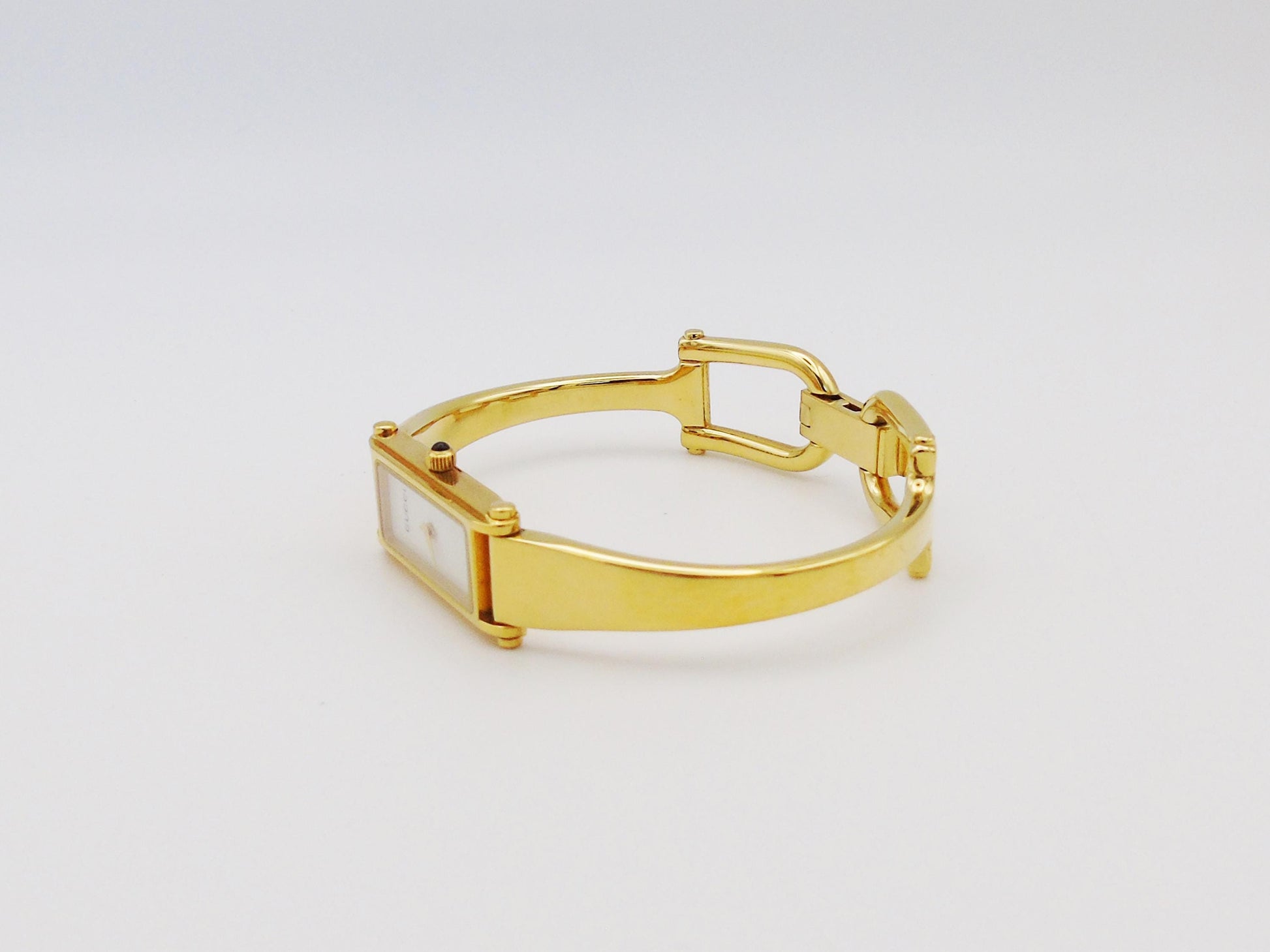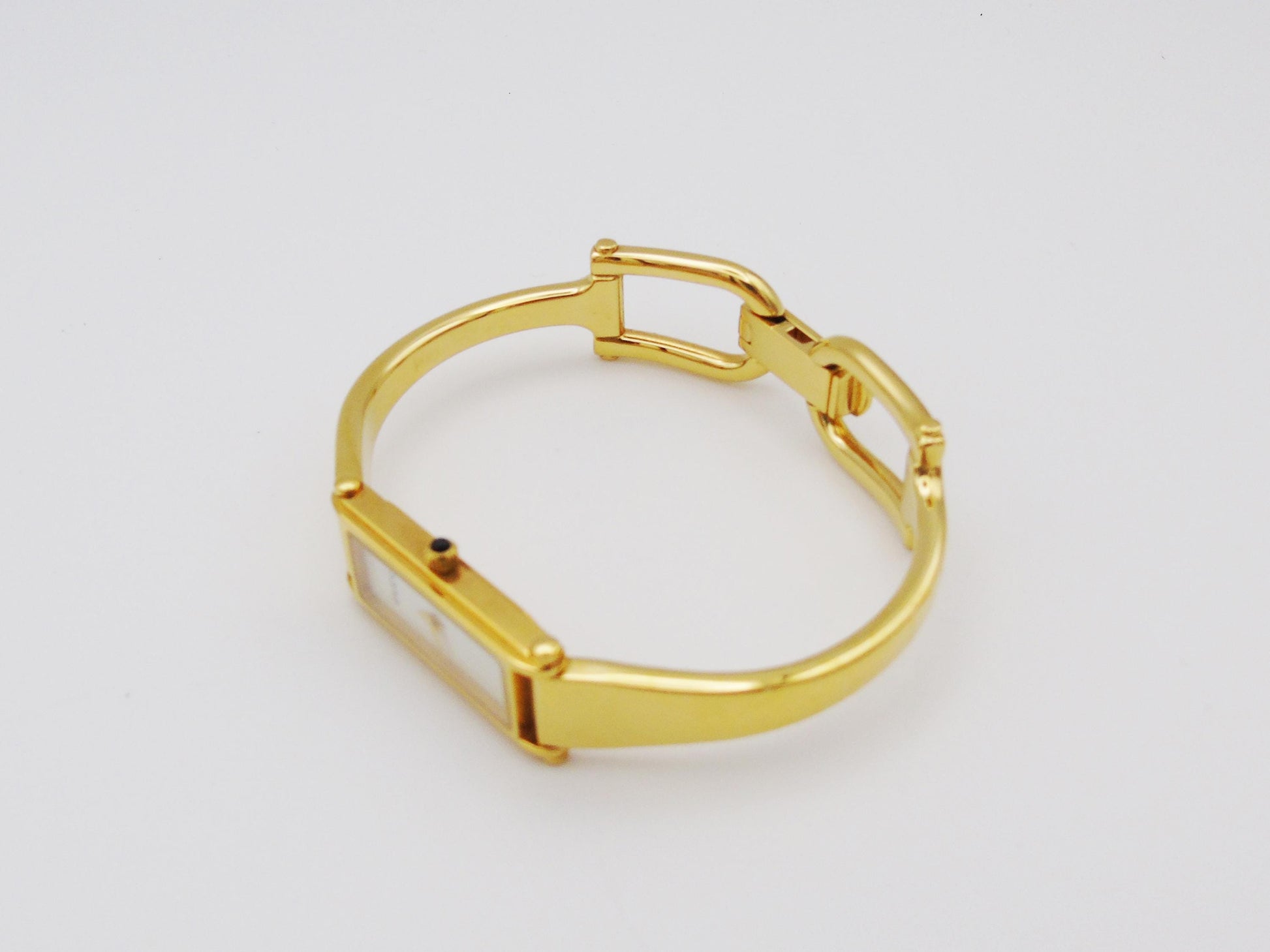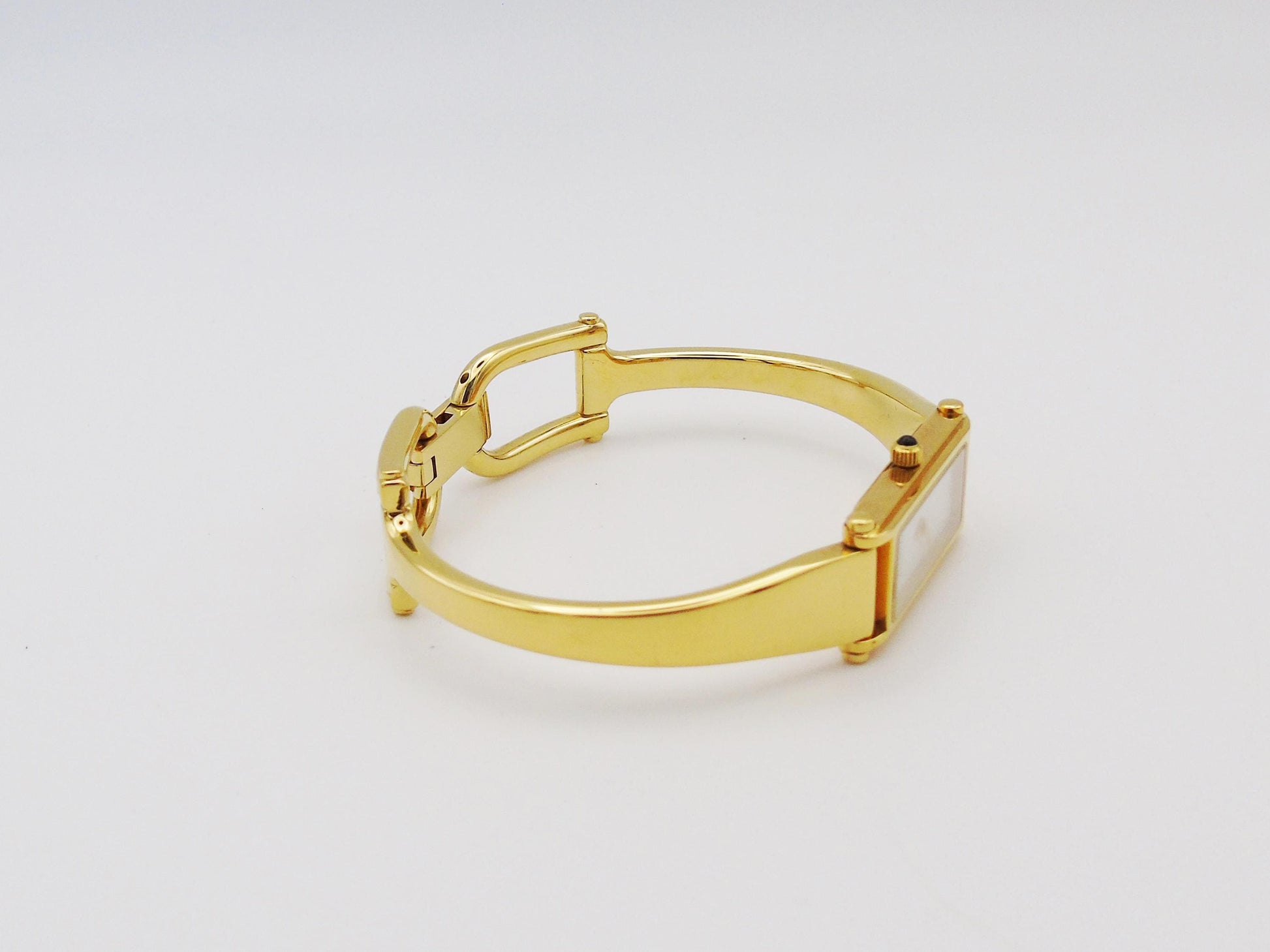 This is a genuine Gucci Ladies Gold Watch is a timeless piece that adds elegance to any collection. The Gucci 1500L model is part of the horsebit collection and it features a stunning mother of pearl dial and a sleek tank watch face, offering a classic and refined look.