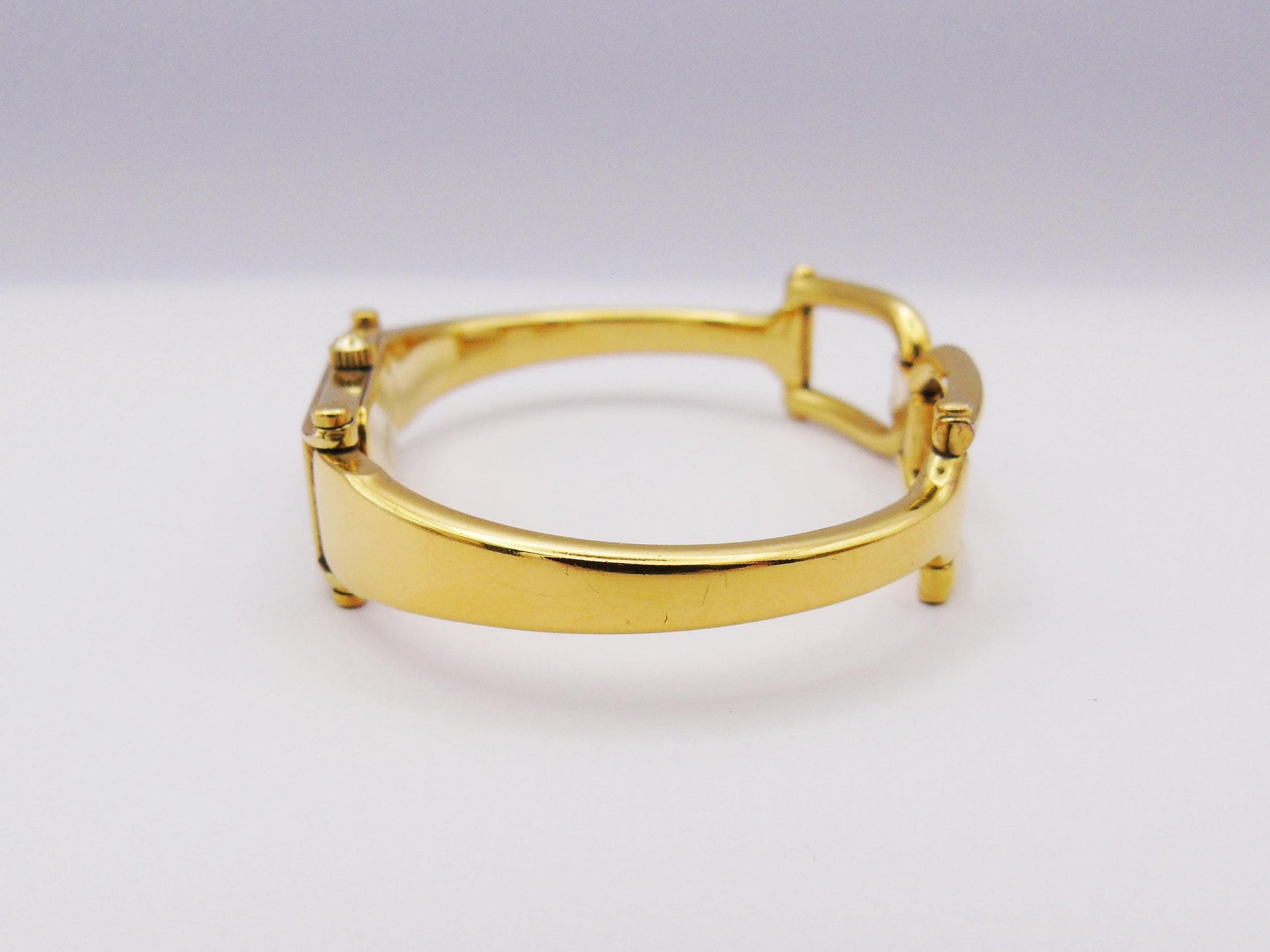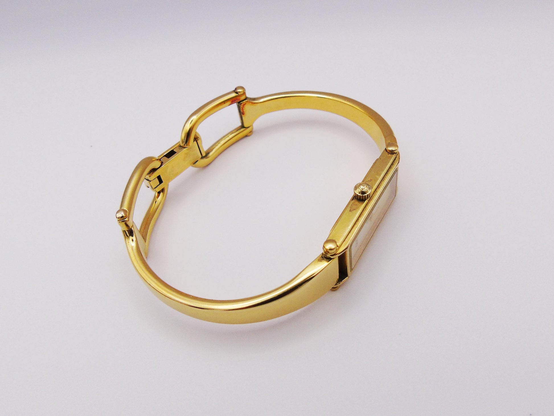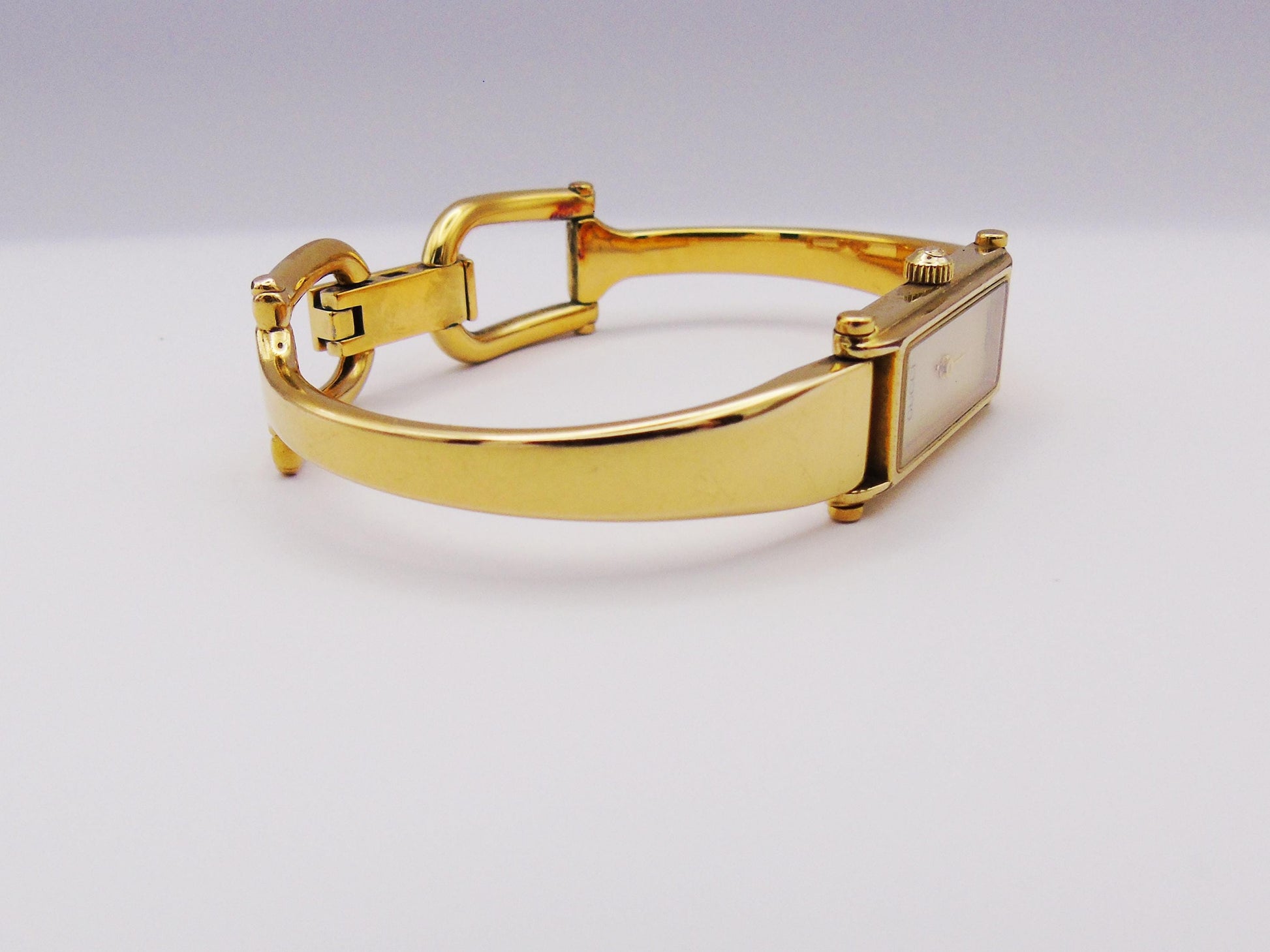 This is a genuine Gucci Ladies Gold Watch is a timeless piece that adds elegance to any collection. The Gucci 1500L model is part of the horsebit collection and it features a stunning mother of pearl dial and a sleek tank watch face, offering a classic and refined look.