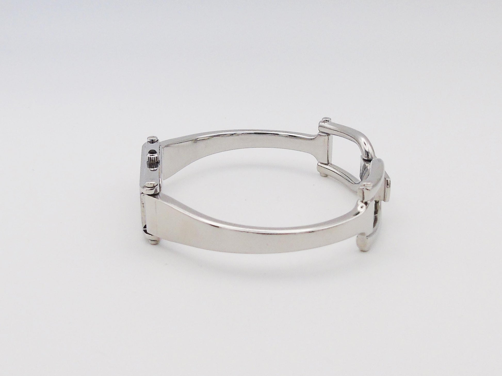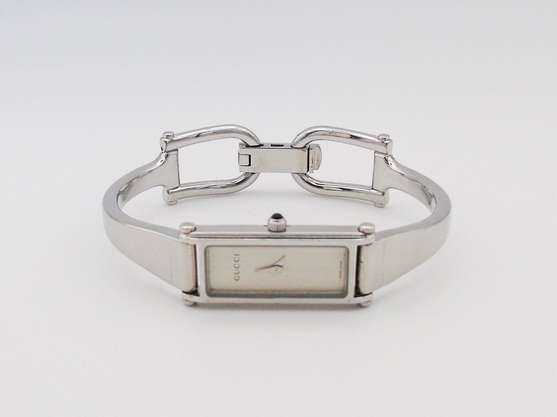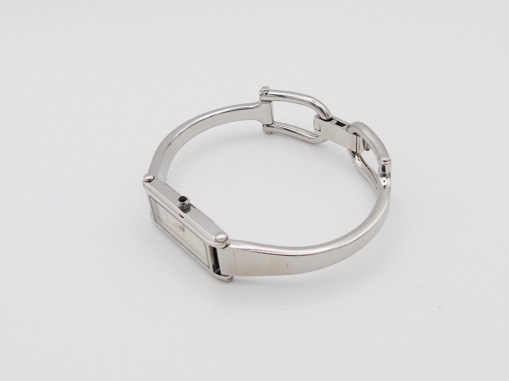 This is a lovely Gucci 1500L ladies watch. It is part of the Horsebit collection and has a strong stainless-steel body. The watch has Swiss quartz movement, so it keeps time well. It is a slim bangle-style watch, great for anyone who loves designer items.
