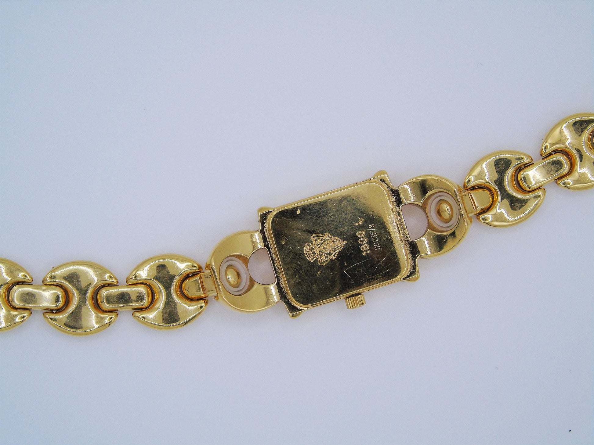 This Gucci Ladies Gold Watch is a timeless piece that combines elegance and versatility. The Gucci 1800L model features a gold-plated stainless steel design with a classic tank watch face, making it a must-have for any luxury watch lover.