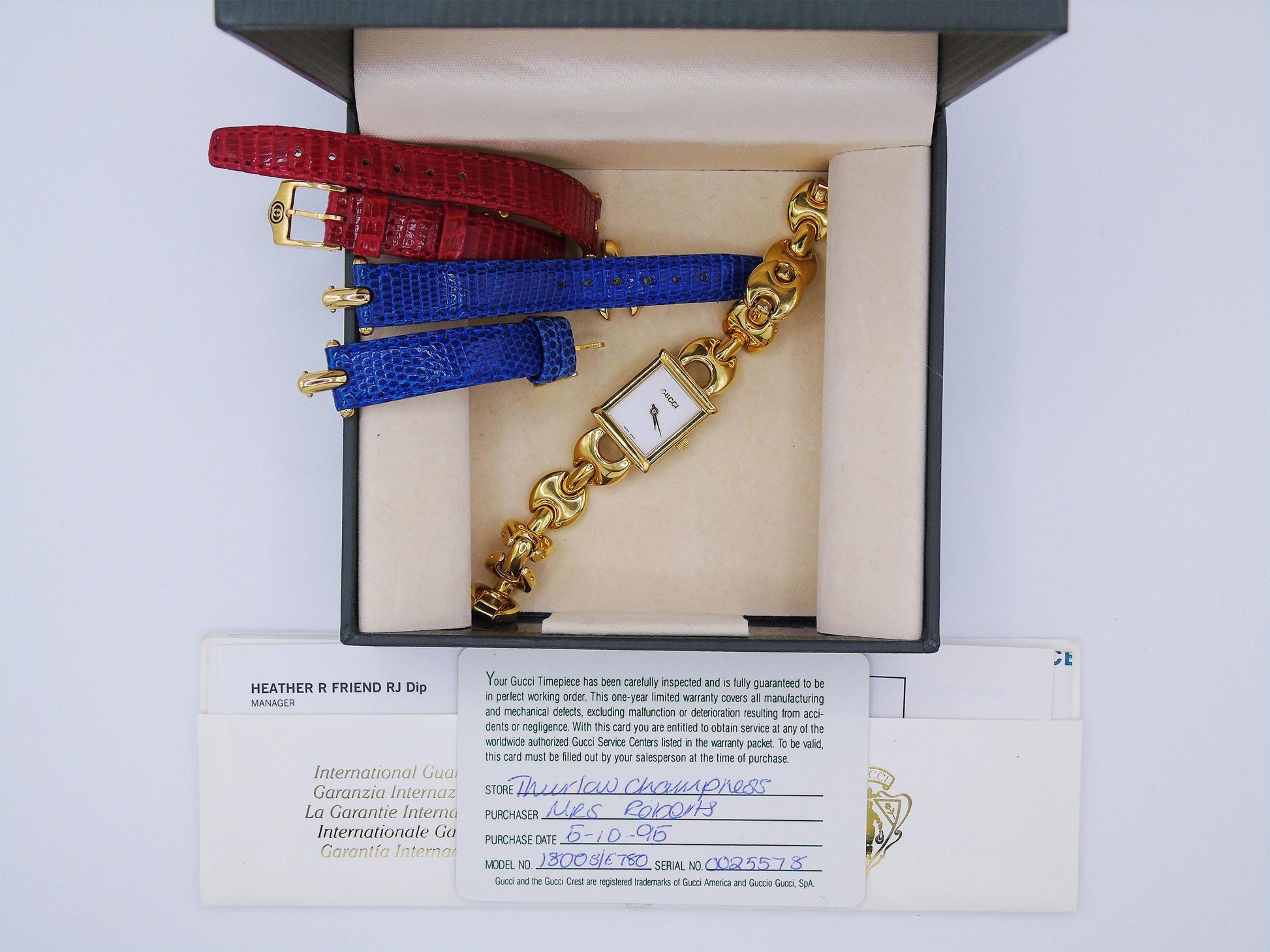 Designed for both style and convenience, this watch allows you to change the strap easily. It comes with a super rare Gucci chain bracelet, two spare links, and two additional leather straps in red and blue. Whether you prefer a bold or classic look, this watch adapts to your style.
