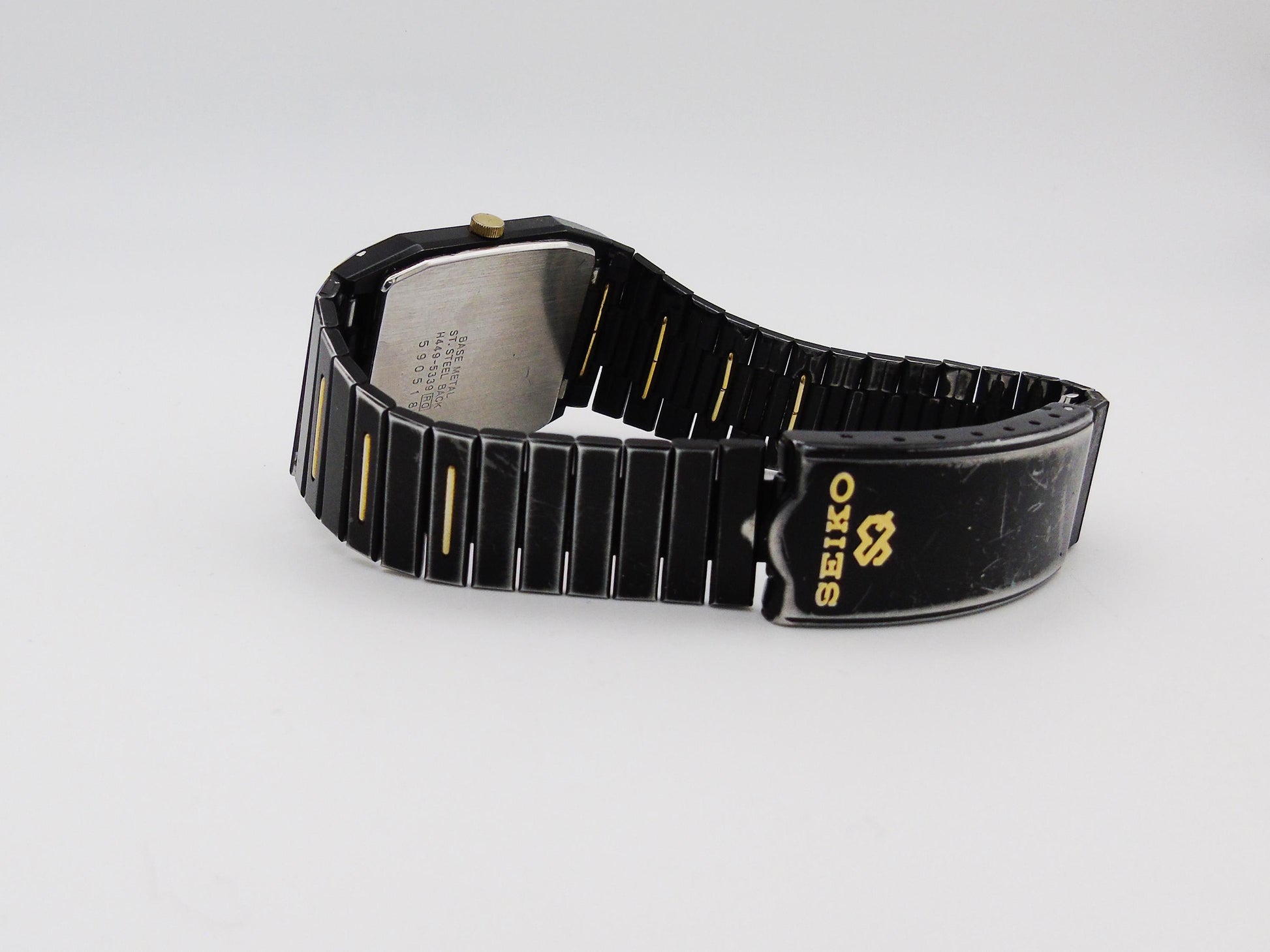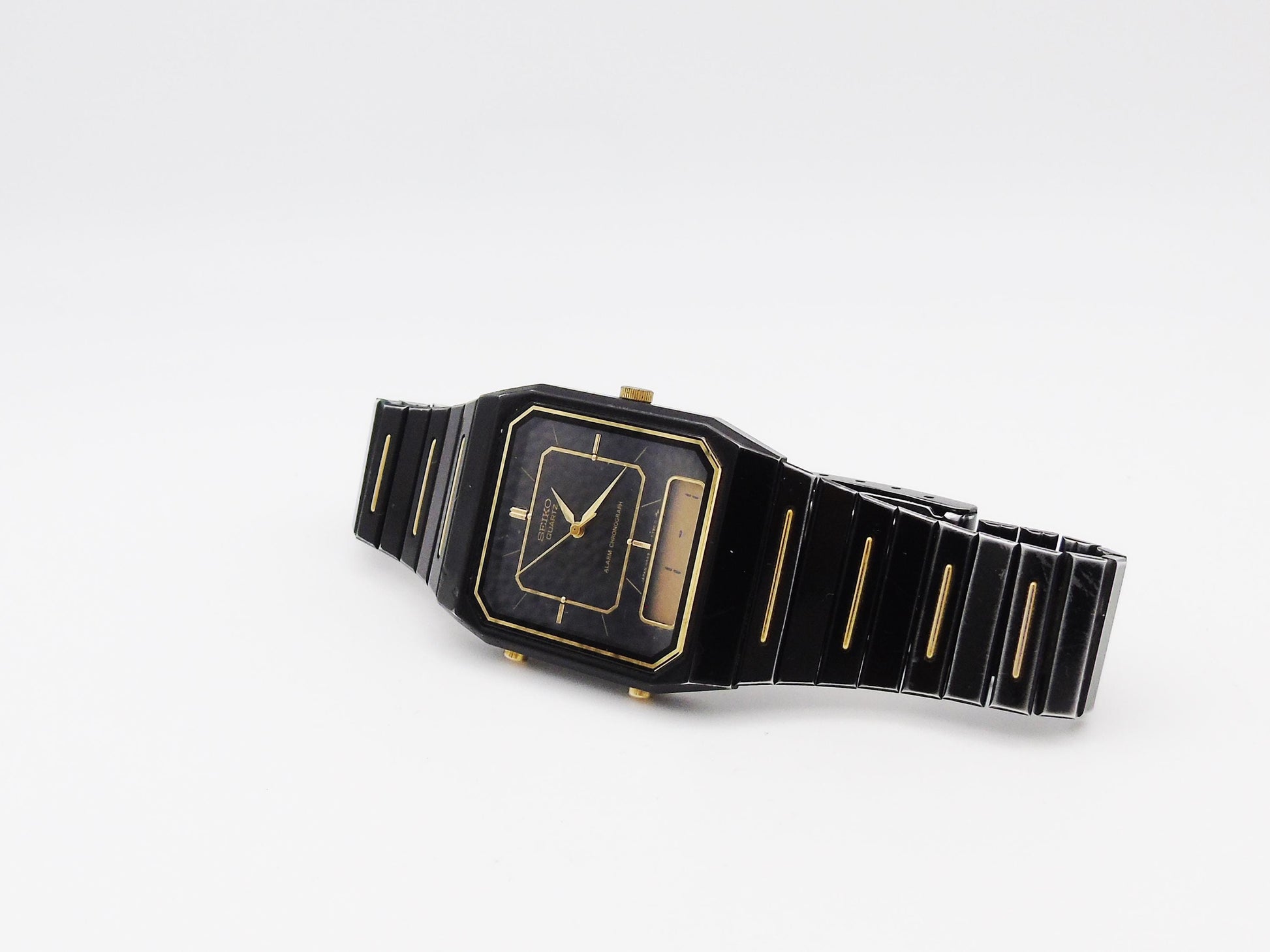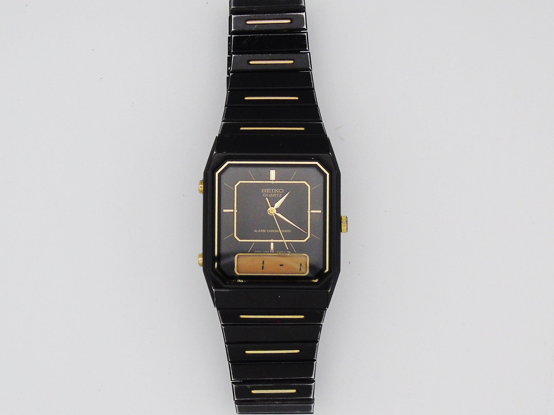 This is a vintage 1984 Seiko watch. It is a digital chronograph with an alarm. The watch has a black and gold design. It runs on quartz and has Swiss movement, so it keeps time well.