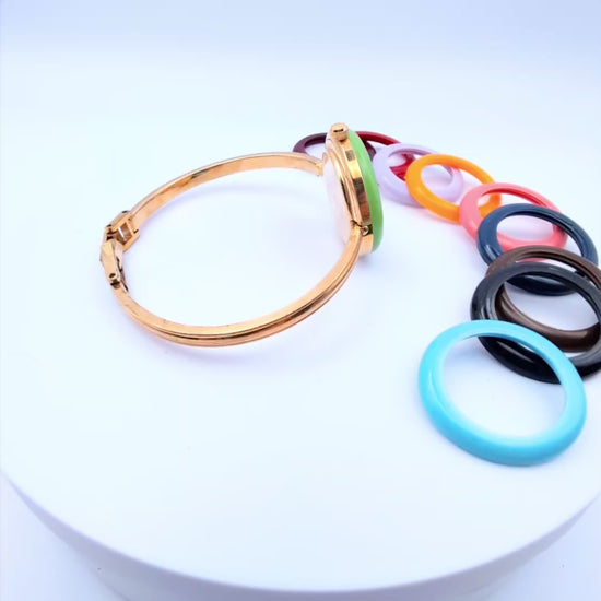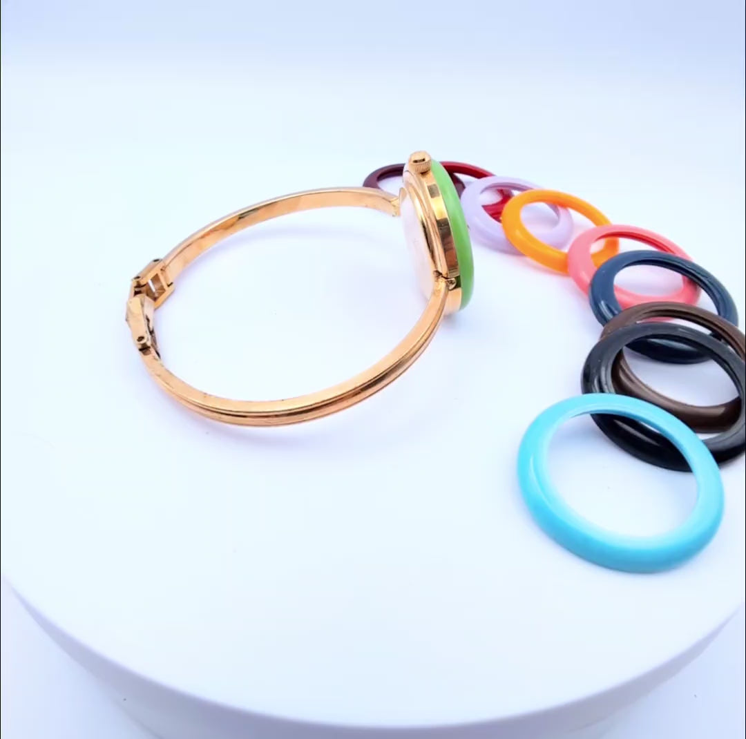 Elevate your style with this stunning Vintage Gucci Change Bezel Watch from the 1990s. This elegant gold accessory features an interchangeable bezel system, allowing you to switch between 11 vibrant bezel colors to match your outfit or mood.