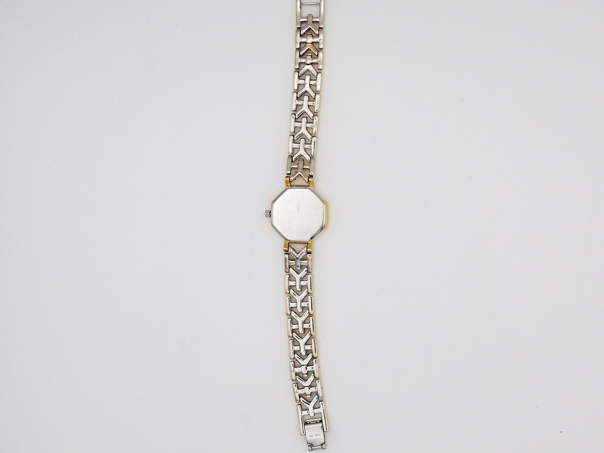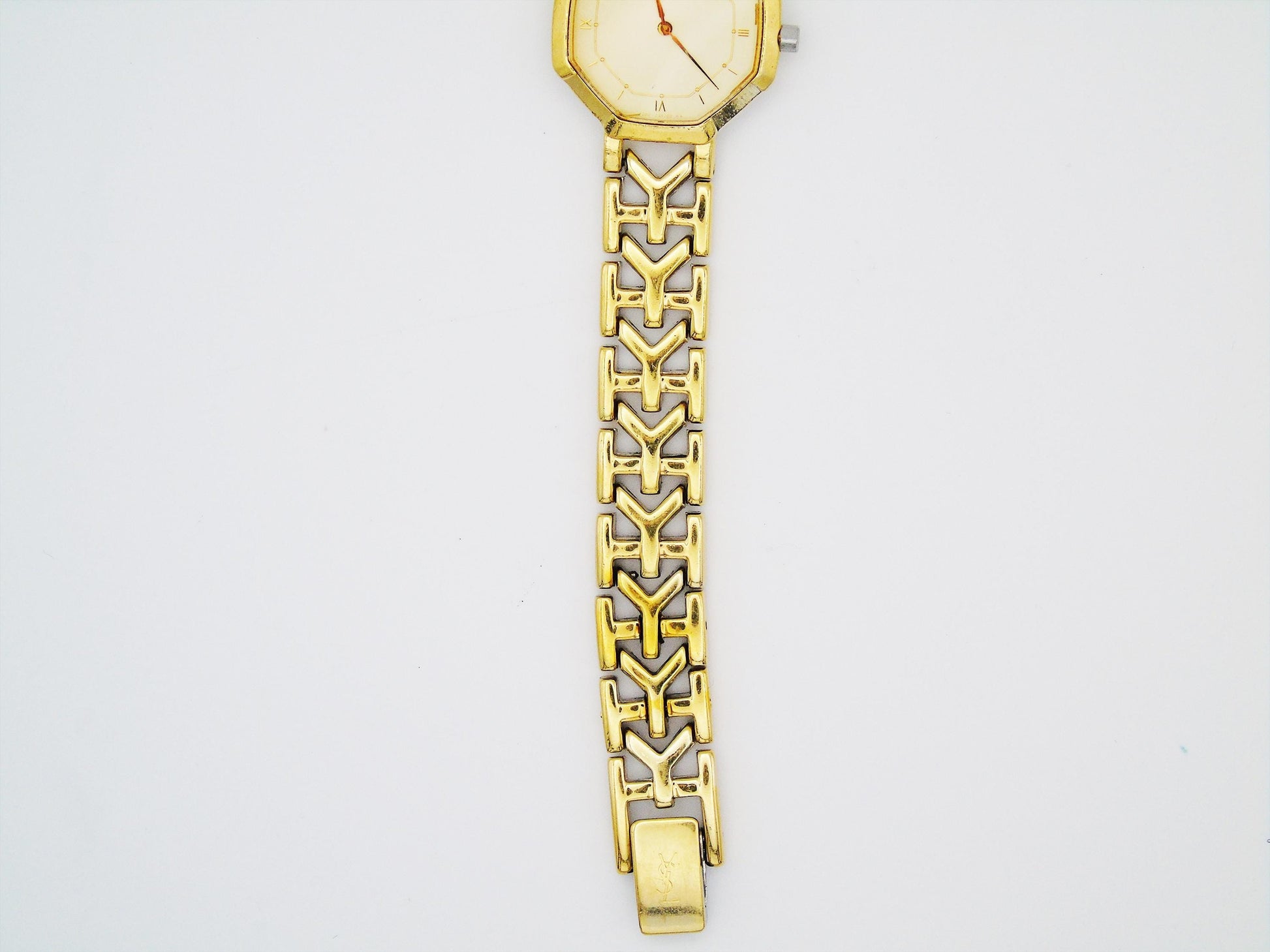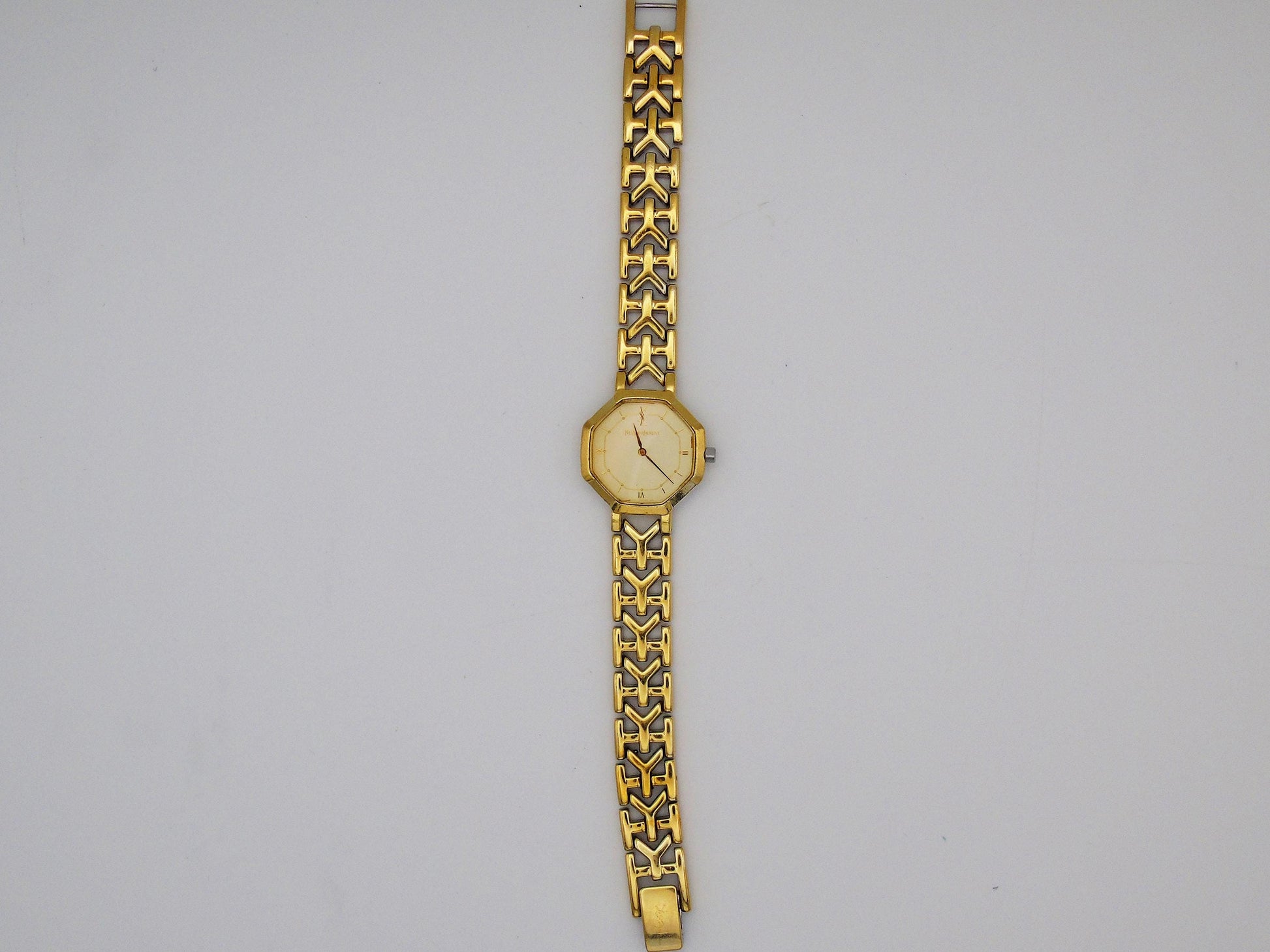 This is a YSL designer watch with a gold-plated case and a gold dial. It has Swiss quartz movement, so it keeps time well. The watch face has a unique irregular octagon shape, which makes it look very special.